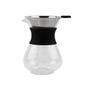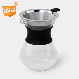 Cafetera de goteo de vidrio con marcador de medición. Incluye filtro en forma de cono de acero inoxidable. Collar de silicon para evitar quemaduras y tener un mejor agarre. Caja individual incluida.