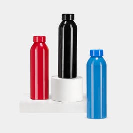 Cilindro de aluminio de una pared. Tapa de plástico con cierre de rosca, asa, boquilla y sobre tapa de presión. Incluye caja individual.