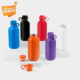 Cilindro de aluminio de una pared. Tapa de plástico con cierre de rosca, asa y popote. Incluye caja individual.