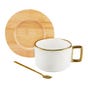 Taza de cerámica con base de bambú y cuchara metálica dorada. Terminado mate con detalle dorado en filo y asa. Incluye caja individual. El bambú es un producto natural el cual puede presentar variaciones en tonalidades y vetas.