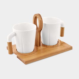 Juego de tazas. Incluye dos tazas de cerámica con asa de bambú, base de bambú con dos porta tazas y caja de regalo. No usar en microondas ni lavavajillas. El bambú es un producto natural el cual puede presentar variaciones en tonalidades y vetas.