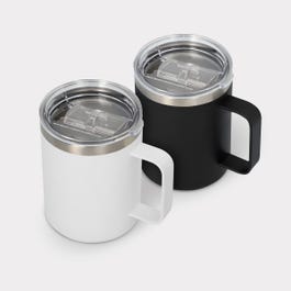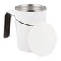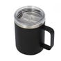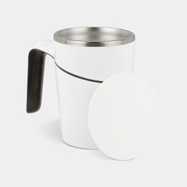 Taza térmica con doble pared de acero inoxidable y asa de plástico.