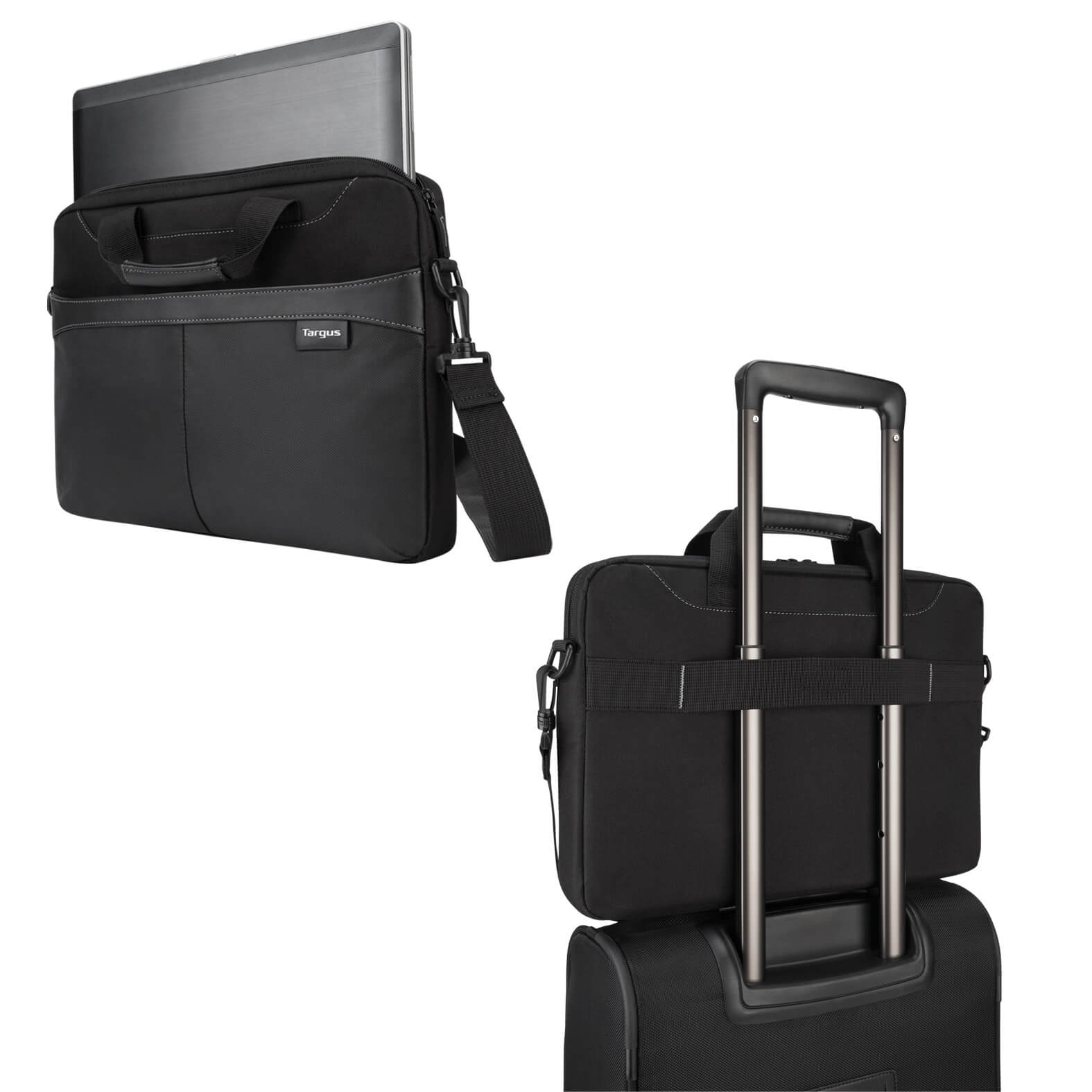 Maletín con acceso de carga superior, compartimento acolchado para computadora portátil de 15,6″. Incluye una correa extraíble para el hombro, manijas de agarre suave, correa, un compartimento acolchado y bolsillo frontal con cremallera.