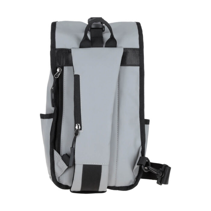 Bolsa de hombro con 3 compartimentos, 1 compartimento principal de doble acceso con 1 compartimento interno, 2 bolsas laterales, 1 bolsa frontal, 1 bolsa en la correa ajustable y asa superior.