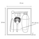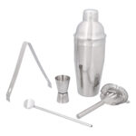 Set para preparación de bebidas. Incluye: shaker de 23 cm de alto por 8 cm de ancho, pinzas, medidor, popote con cucharilla incluida y colador/mezclador.