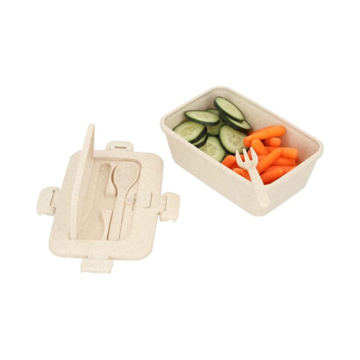 Contenedor para alimento de wheat straw, con clip de seguridad, compartimento superior para cubiertos y soporte para celular. Incluye tenedor y cuchara.