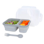 Contenedor de alimentos de silicón, con 2 compartimentos plegables , tapa con cierre hermetico y utensilio 2 en 1.