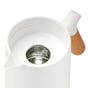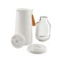 Jarra térmica doble pared. Interior de vidrio y exterior de plástico. Tapa con botón dispensador y asa de bambú. Base removible con sistema de rosca que permite retirar fácilmente el interior para una mejor limpieza. Mantiene temperatura caliente y fría 6 hrs. Incluye caja individual.