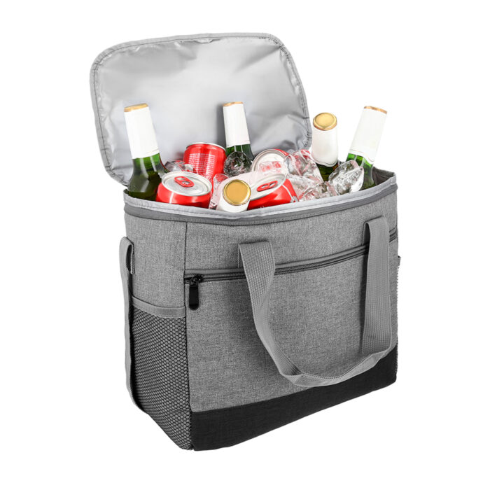 Hielera de poliéster con interior impermeable plastificado, 2 asas con broche de velcro, 1 correa ajustable, 2 compartimentos de malla laterales y 1 compartimento exterior con cierre.