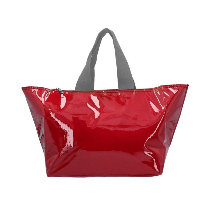 Lonchera con interior metalizado, exterior de plástico, cierre y doble asa.