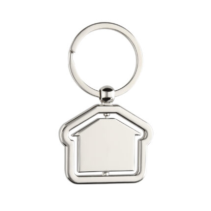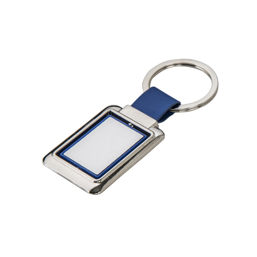Llavero metálico de forma rectangular con centro de color, giratorio, cinta y arillo reforzado para colgar.