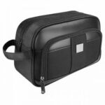 Neceser con cierre y asa en el exterior. Incluye compartimento frontal con doble cierre. Placa metálica removible para fácil grabado.