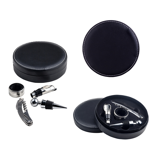 Set de vino con sacacorcho, boquilla, corcho metálico y corta gotas.