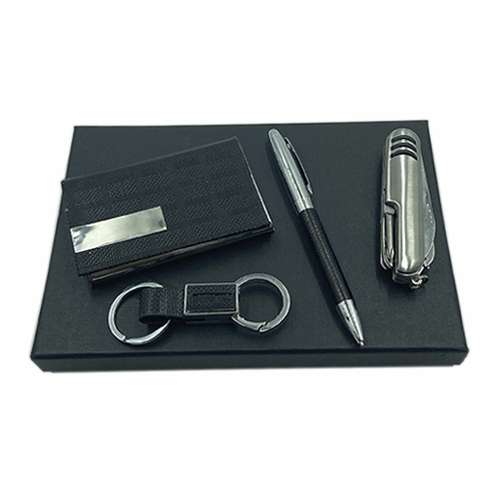 Set ejecutivo Incluye: llavero metálico, porta tarjetero, bolígrafo, navaja y estuche de regalo.