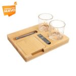 Set de bar con base de bambú. Incluye 2 vasos de cristal para whisky, 4 cubos enfriadores de granito, 2 portavasos de bambú y pinzas para hielo de acero inoxidable. Incluye caja individual.