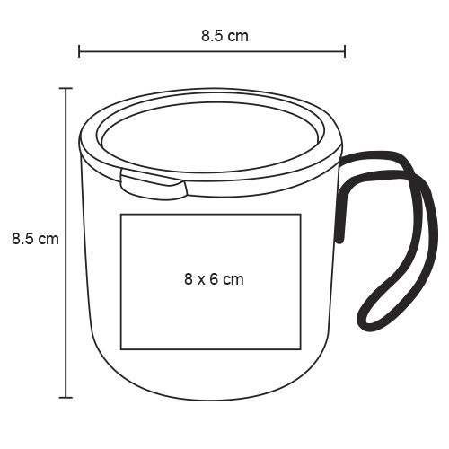 Taza con doble pared de acero inoxidable, asa metálica y tapa traslúcida de cierre a presión con seguro deslizable y boquilla. Incluye bolsa y caja individual.