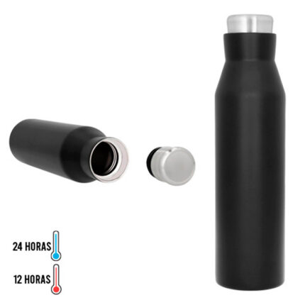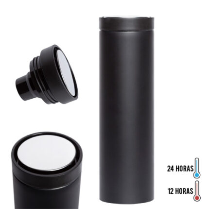 Termo con doble pared de vidrio, tapa de plástico enroscable, boquilla de seguridad a presión y filtro de plástico con rejilla.