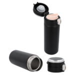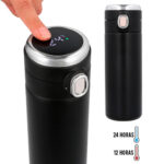 Termo de acero inoxidable y doble pared insulado al vacío, cuenta con tapa de seguridad y termómetro digital que mide la temperatura de tu bebida.