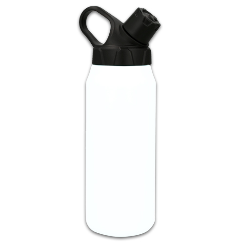 Termo insulado al vacío con doble pared de acero inoxidable y acabado rugoso. Incluye tapa enroscable con boquilla y asa en la parte superior.