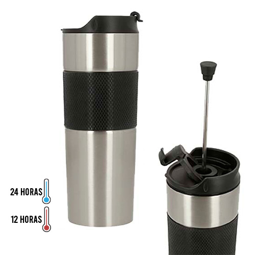 Termo de doble pared de acero inoxidable con prensa francesa, tapa hermética enroscable y manga de silicón.