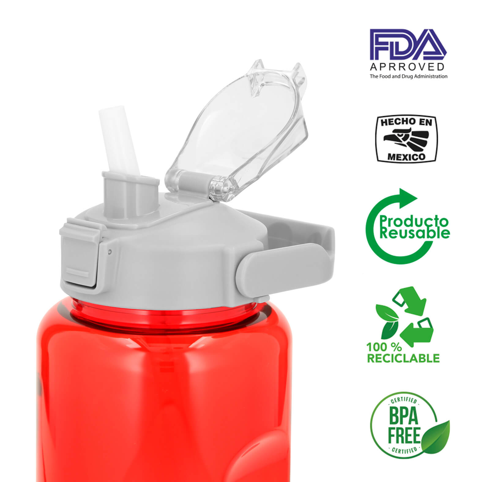 Cilindro de plástico con tapa de seguridad, popote y asa.
