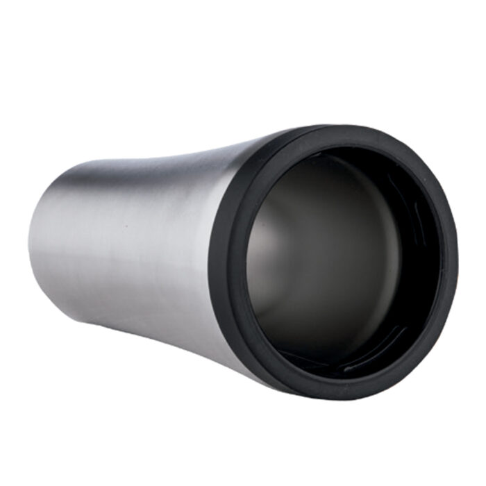 Termo con doble pared de acero inoxidable, tapa hermética enroscable y botón de seguridad para evitar derrames.